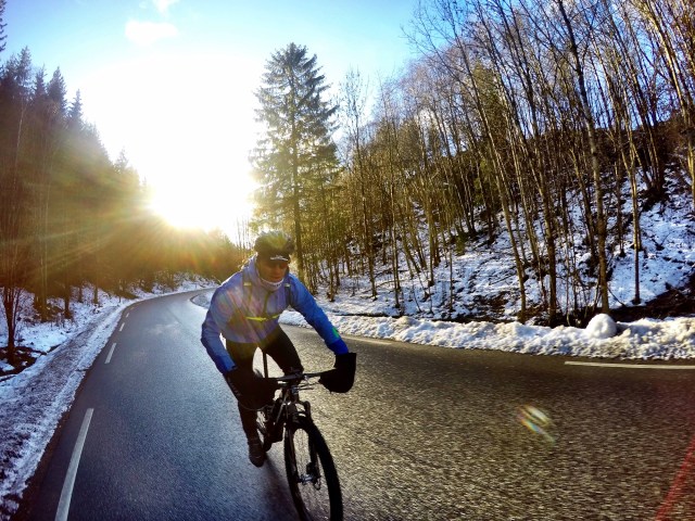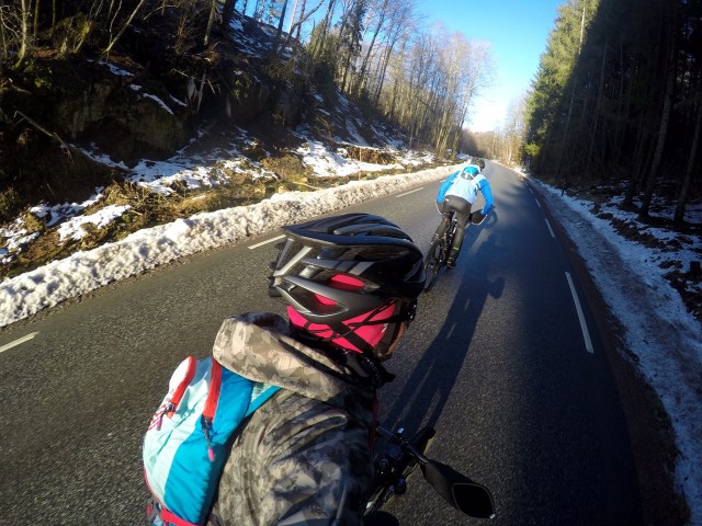 For å få mest mulig tid på sykkelsetet i løpet av vinteren, men minst mulig tid på rulla, har Lars Petter og jeg planer om å sykle mye ute med piggdekk også denne vinteren. I fjor var det en lang periode med herlig barfrost i bakgården vår (Drammensmarka), og vi fikk samlet mange timer, mil og smil på sykkelsetet. Å sykle på rulle er gull for å få intervalløktene vi trenger, men for å få mange timer, og styrke og trøkk i låra, er stisykling på snø og is helt supert. Denne helgen var det litt for mye bløt snø i marka til at vi fikk kickstartet vintersyklingen kun på stier, men vi fikk en finfin tur på asfalt, is, sti og grusveier i nærområdet. Nesten tre timer på sykkelsetet går av seg selv i slikt vær: