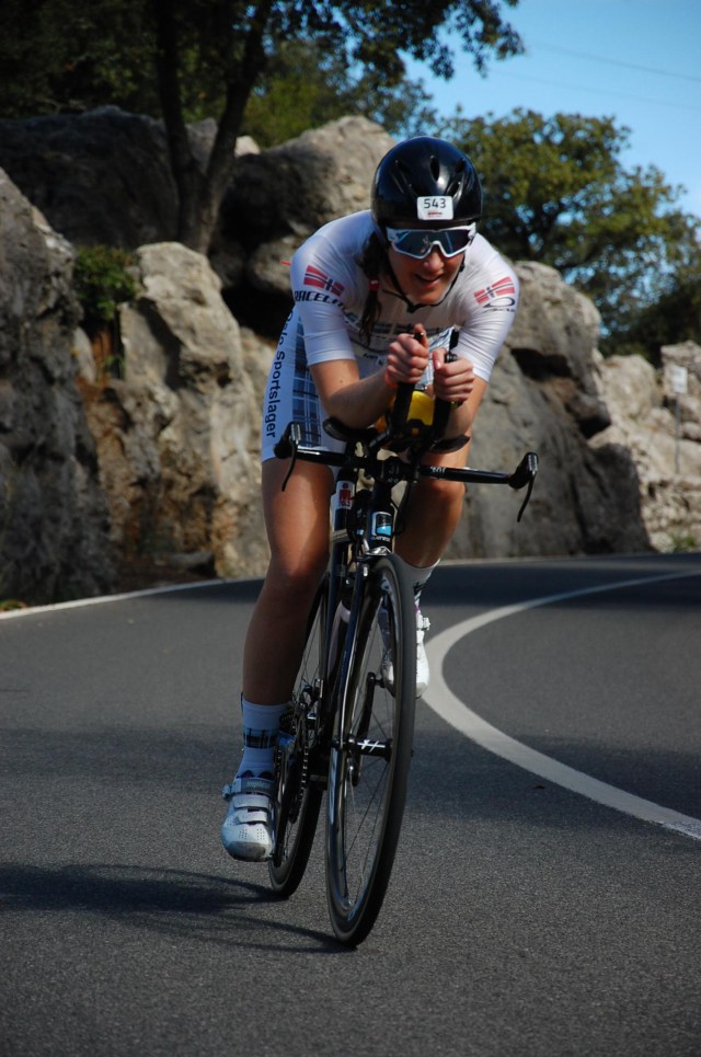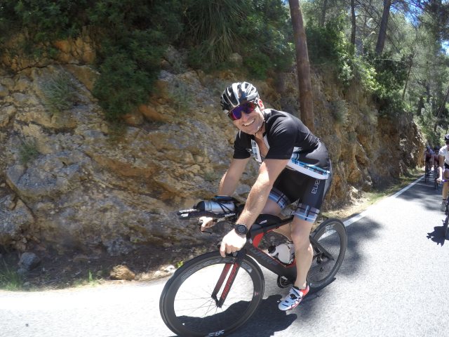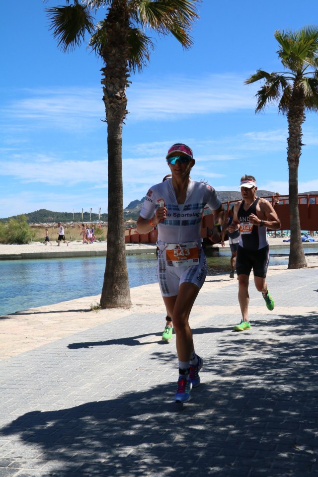 T1 gikk greit, men da jeg tok de første tråkkene holdt jeg nesten pusten. Hvordan står det til med hamstringsen i dag, tenkte jeg? Til min store glede merket jeg ikke så mye, så jeg bestemte meg for å starte litt rolig og så øke etterhvert hvis alt føltes ok. Vondten holdt seg heldigvis borte og jeg kunne tråkke på. Jeg syklet på 02:49:17. Det er ny pers i Mallorca-løypa og det med kjip vind. Veldig fornøyd med det, men sykt irritert på mange konkurrenter som ikke har skjønt at det ikke er lov å drafte. Ekstremt frustrerende når konkurrenter kommer susende forbi i store felt. Skjerpings!! Jeg lå forøvrig på tredjeplass i klassen etter sykkel, men så var det den hamstringsen på løp da…