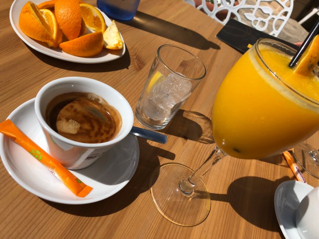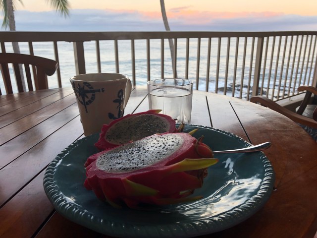 De første dagene våknet vi grytidlig fordi vi var døgnville. Da var det digg å nyte utsikten fra terrassen med en kopp kaffe og lokal dragefrukt før frokost.